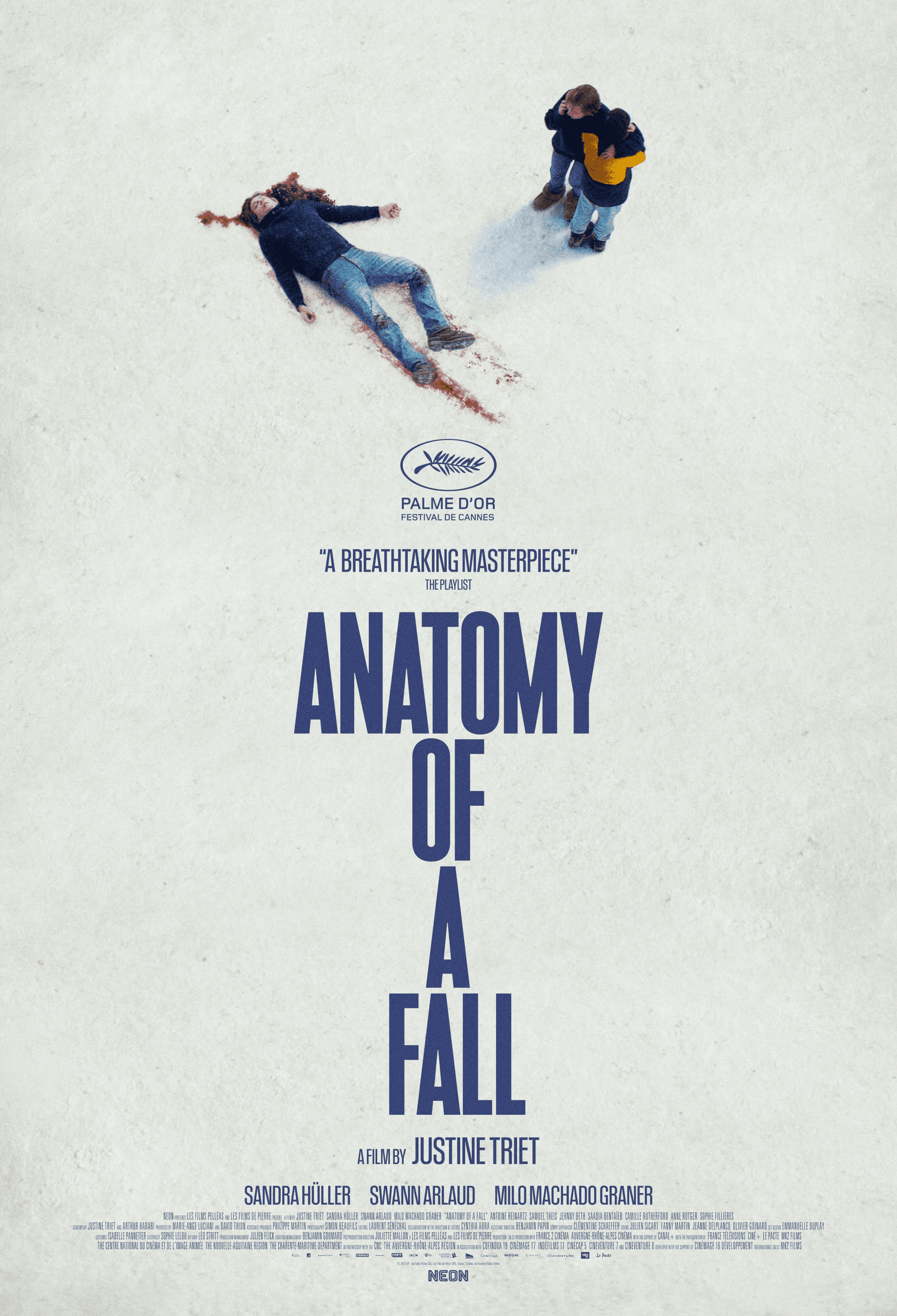 Anatomy of A Fall is a movie directed by Justine Triet, co-written by Justine Triet and Arthur Harari. According to wikipedia, the film premiered at the 76th Cannes Film Festival on 21 May 2023, where it won the Palme d'Or and the Palm Dog Award, and competed for the Queer Palm. It was released theatrically in France by Le Pacte on 23 August 2023, receiving critical acclaim, selling over 1.9 million admissions in France, and winning six awards at the 49th César Awards, including Best Film. The film also received five nominations at the 96th Academy Awards, including Best Picture, Best Director (Triet), Best Actress (Hüller), and won Best Original Screenplay. It has since been cited as among the best films of the 2020s. The story goes like this: in a secluded mountain house somewhere in countryside France, Sandra Voyter (interestingly, the actress’s name is also Sandra) is forced to cut an interview short due to her husband playing music at a disruptive volume from the attic. Shortly after the interviewer departs, their visually impaired son, Daniel, goes for a walk with his guide dog. Upon their return, Daniel discovers his dad's lifeless body in the snow, having apparently fallen to his death. While Sandra maintains the fall was a tragic accident, her lawyer and friend, Vincent, considers the angle of suicide. As the trial progresses, deeply personal grievances surface. Being visually impaired, the son’s testimony became unreliable. Daniel becomes increasingly confused, could mom have killed dad? Is that possible? Or is it not about what’s possible but what he wants to believe in? He eventually decides to tell the judges that he can see his father committing suicide rather than being murdered. It is unclear through the whole movie whether Sandra is guilty or not, even Sandra Huller didn’t know.