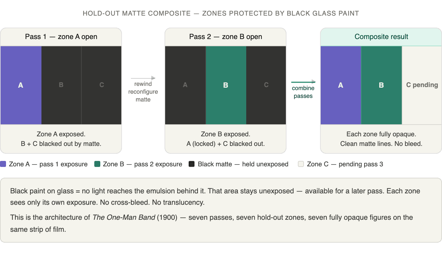 With hold-out mattes (like The One-Man Band) — before each pass, you paint black onto a glass pane to block specific zones of the frame from receiving light. Black on film = no exposure. So zone A gets exposed on pass one, zones B through G stay dark and unexposed, available for later passes. Each element occupies its own clean spatial territory. They don't overlap.