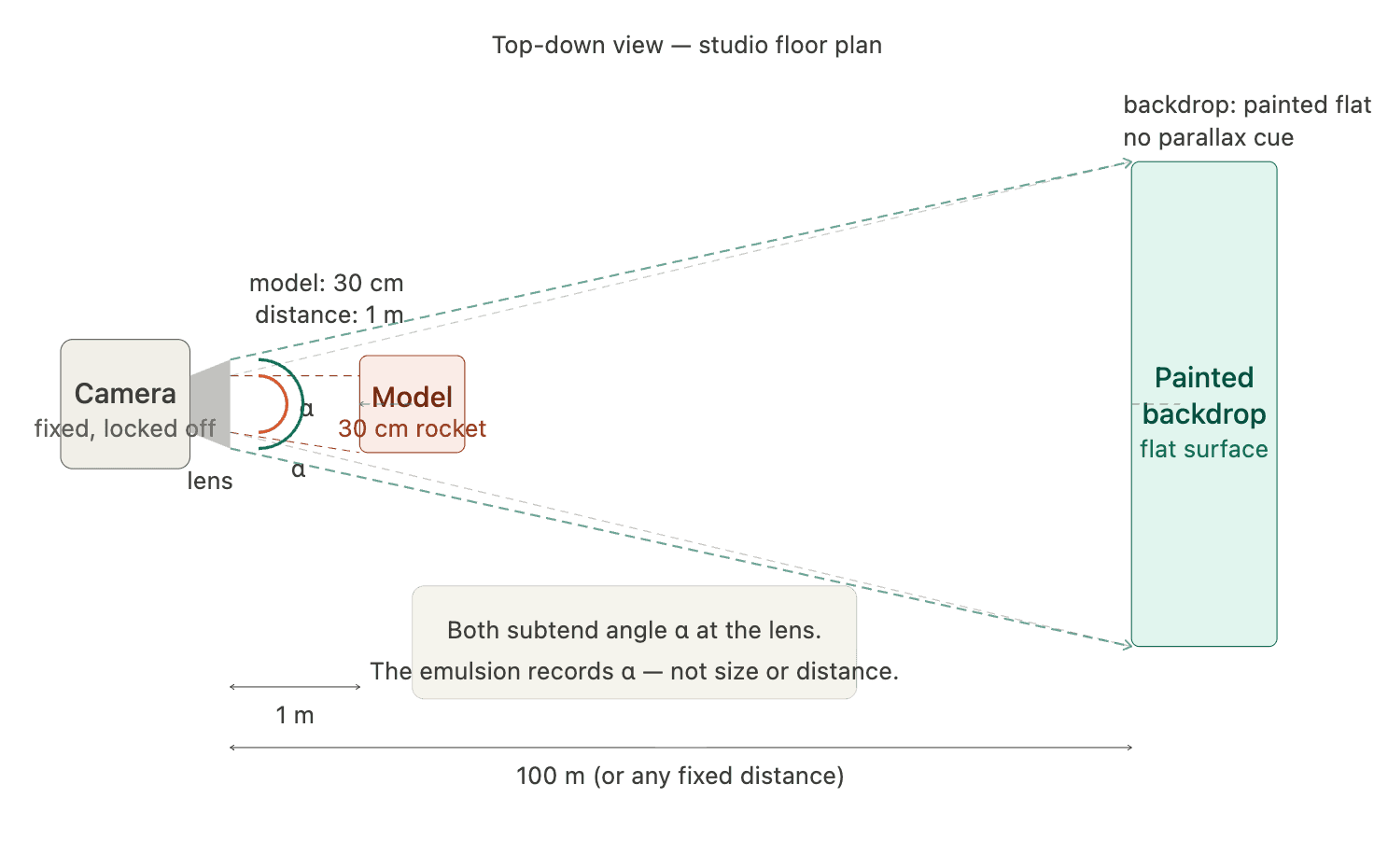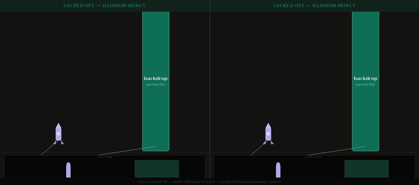 Parallax is something you experience every time you look out a car window. Close objects — a fence post, a road sign — fly past fast. Distant objects — a hill, a building on the horizon — barely seem to move at all. Both are moving relative to you at the same speed, but they don't look like it. That difference in apparent speed is parallax, and it's caused entirely by the difference in distance between you and each object. Now apply that to a film camera shooting a miniature. The model rocket is 30 centimetres from the lens. The painted backdrop is 10 metres away. When the camera is locked off — completely stationary — this distance difference is invisible. The flat image collapses depth. The model and the backdrop both appear to occupy the same plane.