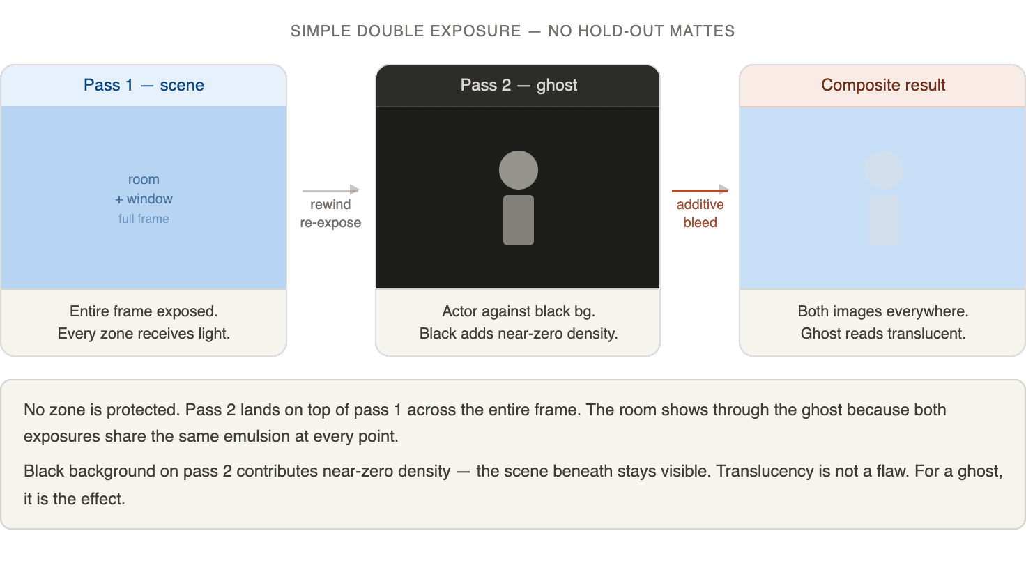 Without hold-out mattes (simple double exposure) — you just run the film through twice with no blocking at all. On pass one, the entire frame gets exposed. On pass two, the entire frame gets exposed again, on top of the first exposure. Every part of the frame now carries both images simultaneously — there's no zone that has only image one or only image two. They exist everywhere at once, stacked on top of each other. The first image shows through the second. Which is exactly why ghosts photographed this way look ghostly — the wall behind them is visible through their body, because the wall was captured in pass one and the actor in pass two, and both are present in every pixel of that area simultaneously.