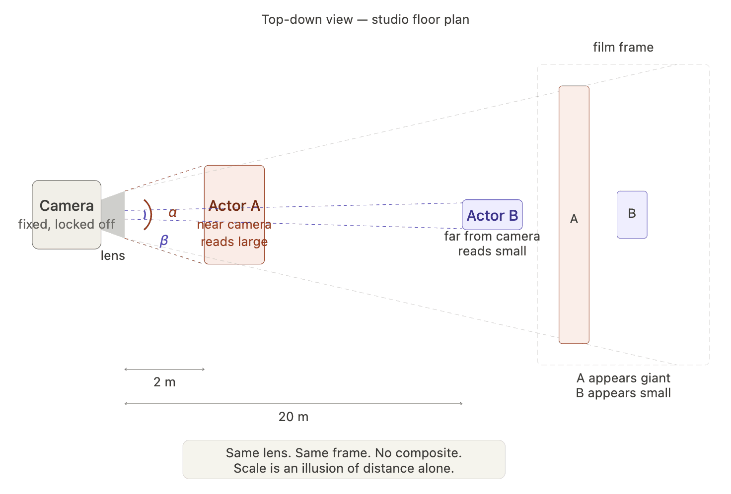 Forced perspective is miniature work's close relative — the manipulation of apparent scale through the deliberate arrangement of objects and figures at different distances from the lens. Where miniatures replace a full-scale object with a small-scale physical proxy, forced perspective uses actual objects and actors but positions them so that their relative angular sizes in the frame misrepresent their actual scale relationship. A full-size actor standing far from camera next to a small prop close to camera will read as a giant next to a normal-sized object, or a normal figure next to an enormous one, depending on framing and context.